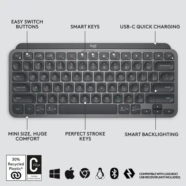 • Compatibility: Fully compatible with Windows, macOS, Linux, ChromeOS, iOS, iPadOS, and Android devices, with support for the Logi Bolt USB receiver (not included).